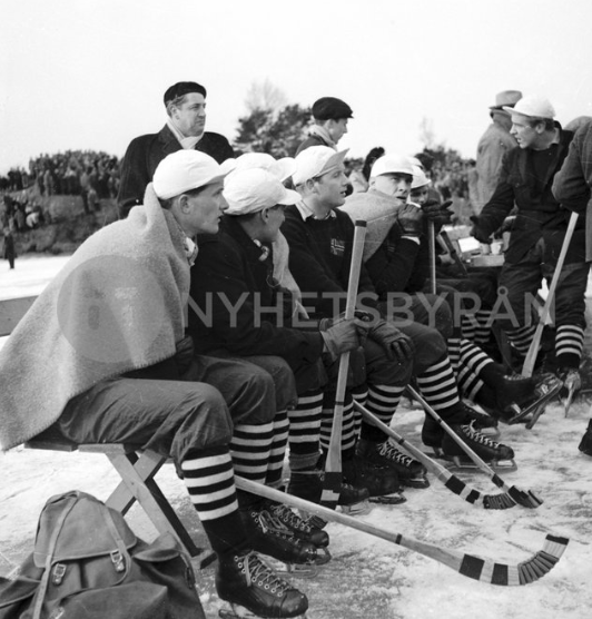 Landskampen i bandy. Sverige vann matchen med 3-1. "Stålmännens stålman" Ejnar Ask sittande närmast,
